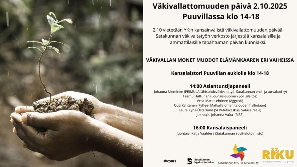 Lämpimästi tervetuloa Satakunnan väkivallattomuuden päivän tapahtumaan YK:n kansainvälisenä väkivallattomuuden päivänä 2.10.